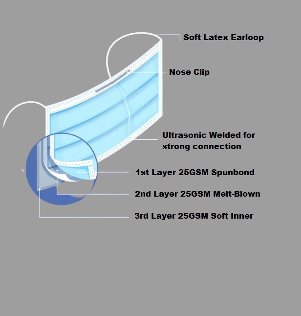 Mask Material : Layer 1 : 25 GSM Spun-bond non woven Type, Layer 2 : 25 GSM Meltblown Filter, Layer 3 : 25 GSM Soft Inner